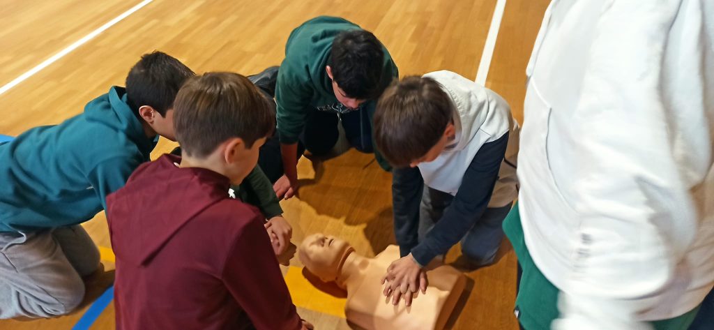 Tuvimos la suerte de contar con maniquíes de práctica cedidos por el Centro de Profesores Ana Abarca de Bolea, lo que permitió al alumnado experimentar de forma realista las maniobras básicas de reanimación cardiopulmonar (RCP). Una experiencia muy enriquecedora que les acerca a la importancia de saber ayudar y actuar con responsabilidad.